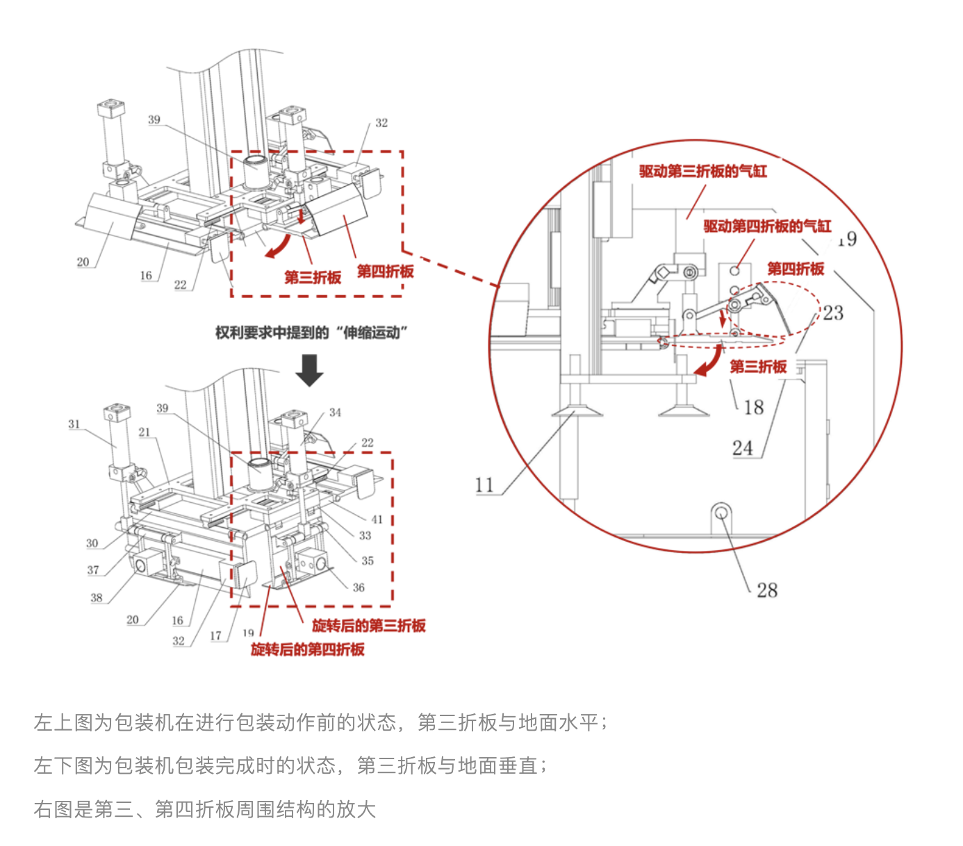 請注意動圖及結構圖中,第四折板的運動方式是“旋轉+平移”,即專利權利要求1中提到的用語“伸縮運動”。觀點列舉