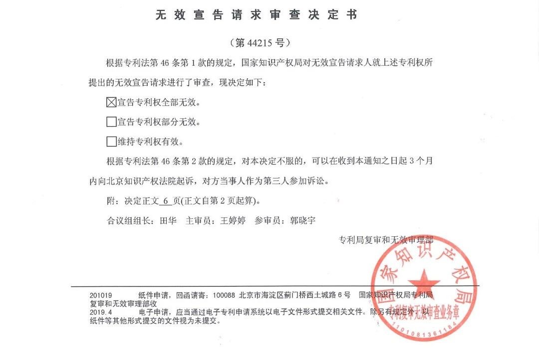 2020年4月24日,國家知識產(chǎn)權局專利復審委員會就專利號為201820458813.9,名稱為“受話器及電子設備”,由三聚陽光及旗下易聚律所代理無效宣告請求人的專利無效宣告案作出當庭宣告,宣告該專利專利權全部無效。