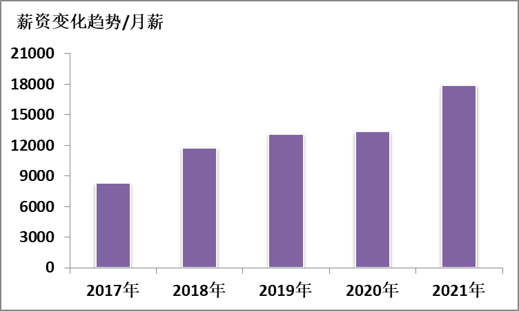 圖4展示出了小伙伴們比較關(guān)心的薪資統(tǒng)計(jì)數(shù)據(jù),不難看出,近年來(lái)專(zhuān)利分析師的薪資一路看漲,崗位平均月薪在2018年和2021年分別實(shí)現(xiàn)了較大幅度的增長(zhǎng),2021年平均月薪更是接近18k,或許有些人會(huì)說(shuō),和互聯(lián)網(wǎng)項(xiàng)目比這還算不上高薪,但我們關(guān)注的應(yīng)該是趨勢(shì),是詩(shī)和遠(yuǎn)方。
