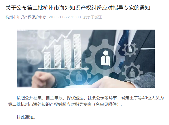 兩位專家在知識產權領域均具備深厚的專業(yè)知識和豐富的實踐經驗,入選后將為杭州市在應對復雜的國際知識產權挑戰(zhàn)中提供重要的戰(zhàn)略指導和專業(yè)支持。