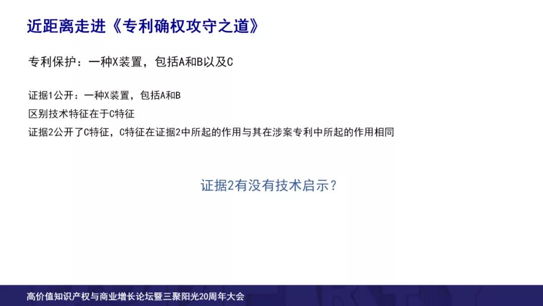我們問一個問題,證據(jù) 2 有沒有技術啟示?我們從一個發(fā)明人發(fā)明一個技術的時候,真正的出發(fā)點一步一步來看,到底能不能得到一個涉案專利?這里可以看到,不僅僅考慮三個最重要的要素,我們還要考慮很多輔助的元素。我們考慮“某一個技術結合現(xiàn)有技術的時候,它能不能結合?結合以后能不能得到涉案專利?”這些問題的時候我們不可避免的要考慮這些輔助因素,包括技術領域、適用場景、結合障礙還包括大家對于技術的認識水平。所以技術啟示的判斷問題就希望做到這一點,能夠讓大家更好認識發(fā)明創(chuàng)造的過程。